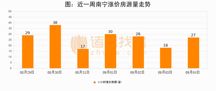 根据诸葛找房数据显示,南宁24小时涨价房源量为27套,较09月03日增加9套,环比上涨50%。与此同时,涨价房源占比小幅扩大,业主信心有所提升。