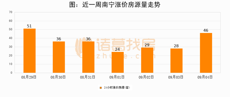 根据诸葛找房数据显示,南宁24小时涨价房源量为46套,较09月03日增加18套,环比上涨64.3%。与此同时,涨价房源占比小幅扩大,业主信心有所提升。