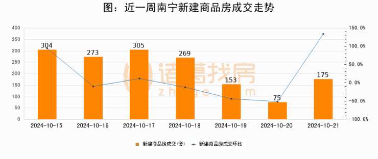 根据南宁市住房和城乡建设局数据显示,2024年10月21日南宁新建商品房成交175套,较昨日增加100套,环比上涨133.3%