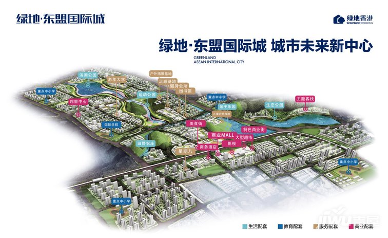 绿地·东盟国际城是世界500强绿地以结合多年高级城市运营商积淀,携手国际知名规划公司阿特金斯大手笔打造的国际级水准巨著,以“三心造极,千亿造城”为规划理念的磅礴大城,为南宁人居、商业格局升级、区域价值提升做出重要贡献。项目聚合高铁地铁红利、撤县设区红利、大学城红利等七大南宁北发展红利,涵盖“大教育、大商业、大颐养”三大产业,形成文化商业、休闲商务、体育运动、精英聚落、滨水生态、智慧创意6大特色板块,助力南宁北新中心崛起。