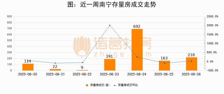 从存量房来看,2025年06月26日南宁存量房单日成交218套,比昨日增加55套,环比上涨33.7%。从近一周存量房成交来看,南宁存量房日均成交套数为201套,06月26日单日成交218套,高于近一周平均水平8.5%。