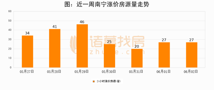 根据诸葛找房数据显示,南宁24小时涨价房源量为27套,较06月01日持平。