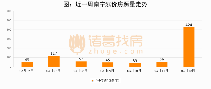 根据诸葛找房数据显示,南宁24小时涨价房源量为424套,较03月11日增加368套,环比上涨657.1%。与此同时,涨价房源占比小幅扩大,业主信心有所提升。