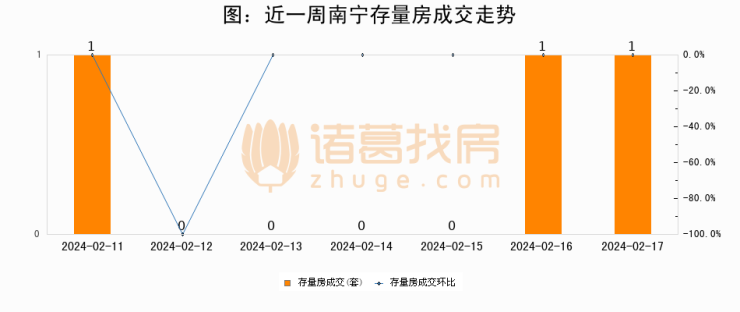 从存量房来看,2024年02月17日南宁存量房单日成交1套,比昨日持平。。从近一周存量房成交来看,南宁存量房日均成交套数为0套,02月17日单日成交1套,高于近一周平均水平0%。
