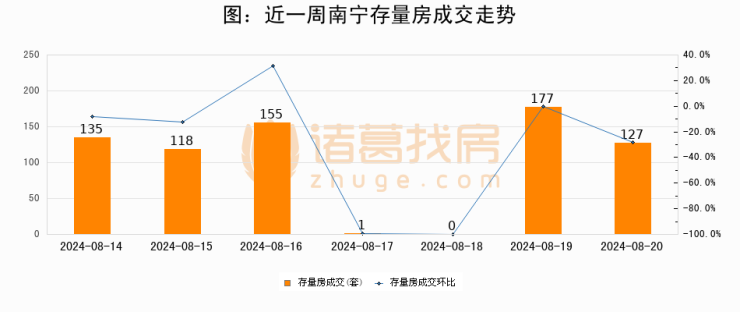 从存量房来看,2024年08月20日南宁存量房单日成交127套,比昨日减少50套,环比下降28.2%。从近一周存量房成交来看,南宁存量房日均成交套数为101套,08月20日单日成交127套,高于近一周平均水平25.7%。