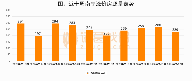 从调价房源来看,第22周南宁涨价房源229套,较上周下降13.9%。与此同时,22周涨价房源占比提升0.53个百分点,业主信心持续恢复。