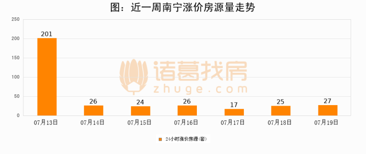 根据诸葛找房数据显示,南宁24小时涨价房源量为27套,较07月18日增加2套,环比上涨8%。与此同时,涨价房源占比小幅扩大,业主信心有所提升。