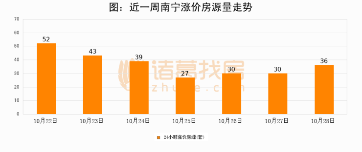 根据诸葛找房数据显示,南宁24小时涨价房源量为36套,较10月27日增加6套,环比上涨20%。与此同时,涨价房源占比小幅扩大,业主信心有所提升。