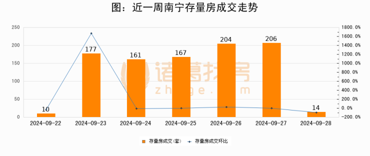 从存量房来看,2024年09月28日南宁存量房单日成交14套,比昨日减少192套,环比下降93.2%。从近一周存量房成交来看,南宁存量房日均成交套数为134套,09月28日单日成交14套,低于近一周平均水平89.6%。