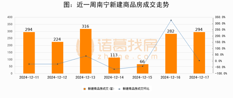 根据南宁市住房和城乡建设局数据显示,2024年12月17日南宁新建商品房成交294套,较昨日增加12套,环比上涨4.3%