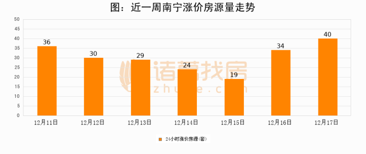 根据诸葛找房数据显示,南宁24小时涨价房源量为40套,较12月16日增加6套,环比上涨17.6%。与此同时,涨价房源占比小幅扩大,业主信心有所提升。