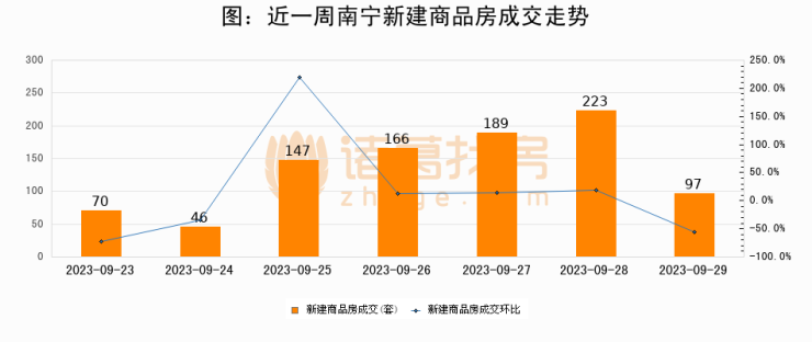 根据南宁市住房和城乡建设局数据显示,2023年09月29日南宁新建商品房成交97套,较昨日减少126套,环比下降56.5%