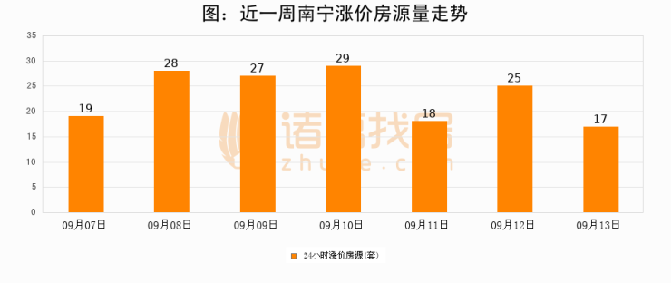 根据诸葛找房数据显示,南宁24小时涨价房源量为17套,较09月12日减少8套,环比下降32%。与此同时,涨价房源占比小幅回落,对于购房者来说是一个入市窗口期,购房者可抓住时机入市。