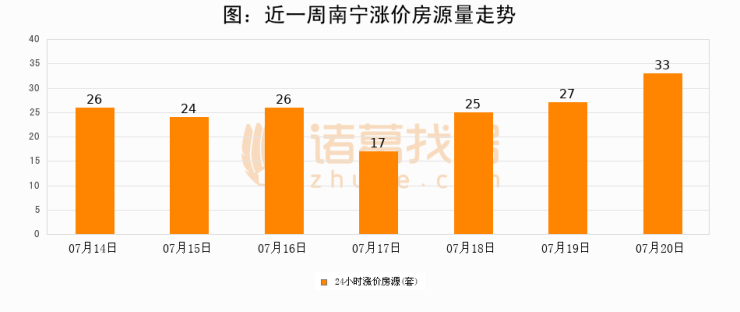 根据诸葛找房数据显示,南宁24小时涨价房源量为33套,较07月19日增加6套,环比上涨22.2%。与此同时,涨价房源占比小幅扩大,业主信心有所提升。