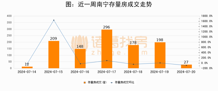 从存量房来看,2024年07月20日南宁存量房单日成交27套,比昨日减少171套,环比下降86.4%。从近一周存量房成交来看,南宁存量房日均成交套数为152套,07月20日单日成交27套,低于近一周平均水平82.2%。