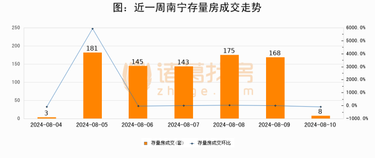 从存量房来看,2024年08月10日南宁存量房单日成交8套,比昨日减少160套,环比下降95.2%。从近一周存量房成交来看,南宁存量房日均成交套数为117套,08月10日单日成交8套,低于近一周平均水平93.2%。