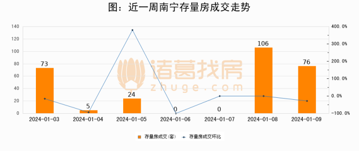 从存量房来看,2024年01月09日南宁存量房单日成交76套,比昨日减少30套,环比下降28.3%。从近一周存量房成交来看,南宁存量房日均成交套数为40套,01月09日单日成交76套,高于近一周平均水平90%。