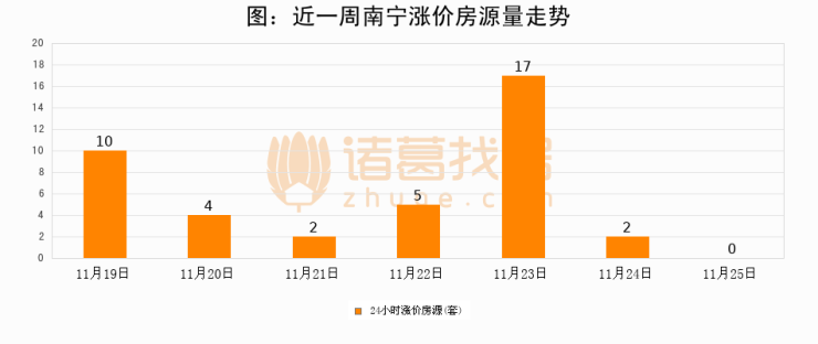 根据诸葛找房数据显示,南宁24小时涨价房源量为0套,较11月24日减少2套,环比下降100%。与此同时,涨价房源占比小幅回落,对于购房者来说是一个入市窗口期,购房者可抓住时机入市。