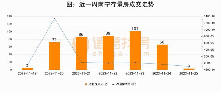 从存量房来看,2023年11月25日南宁存量房单日成交3套,比昨日减少63套,环比下降95.5%。从近一周存量房成交来看,南宁存量房日均成交套数为60套,11月25日单日成交3套,低于近一周平均水平95%。