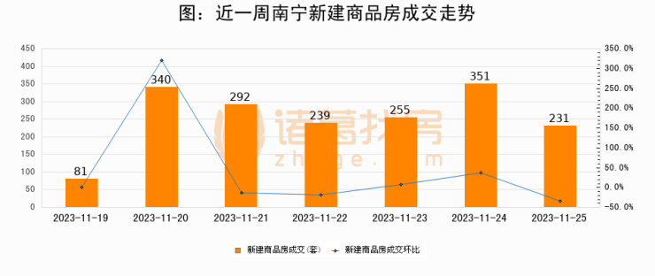 根据南宁市住房和城乡建设局数据显示,2023年11月25日南宁新建商品房成交231套,较昨日减少120套,环比下降34.2%