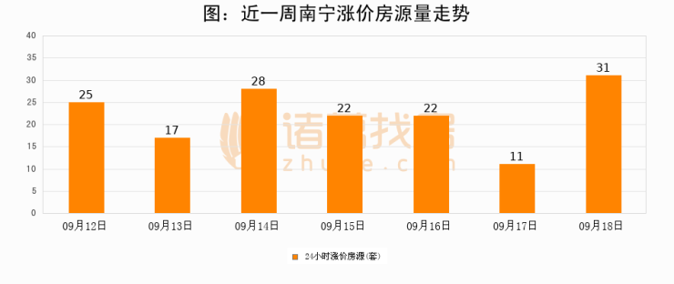 根据诸葛找房数据显示,南宁24小时涨价房源量为31套,较09月17日增加20套,环比上涨181.8%。与此同时,涨价房源占比小幅扩大,业主信心有所提升。