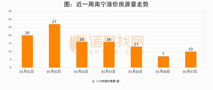 根据诸葛找房数据显示,南宁24小时涨价房源量为10套,较04月06日增加3套,环比上涨42.9%。与此同时,涨价房源占比小幅扩大,业主信心有所提升。