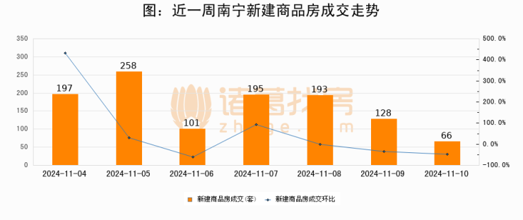 根据南宁市住房和城乡建设局数据显示,2024年11月10日南宁新建商品房成交66套,较昨日减少62套,环比下降48.4%