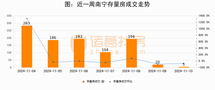 从存量房来看,2024年11月10日南宁存量房单日成交5套,比昨日减少15套,环比下降75%。从近一周存量房成交来看,南宁存量房日均成交套数为140套,11月10日单日成交5套,低于近一周平均水平96.4%。
