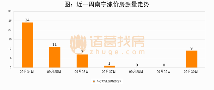 根据诸葛找房数据显示,南宁24小时涨价房源量为9套,较09月29日增加9套,环比上涨0%。与此同时,涨价房源占比小幅扩大,业主信心有所提升。