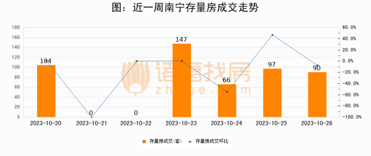 从存量房来看,2023年10月26日南宁存量房单日成交90套,比昨日减少7套,环比下降7.2%。从近一周存量房成交来看,南宁存量房日均成交套数为72套,10月26日单日成交90套,高于近一周平均水平25%。