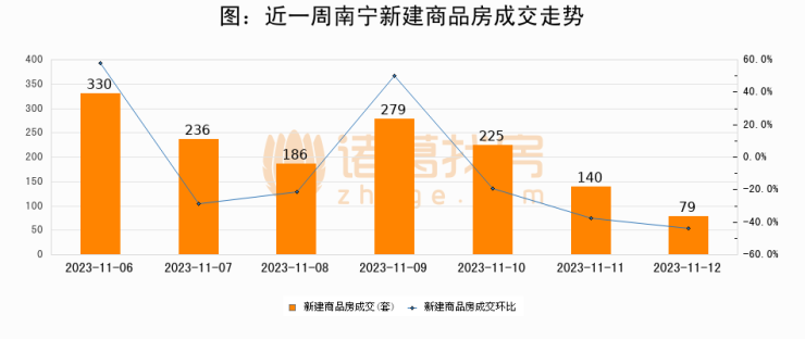 根据南宁市住房和城乡建设局数据显示,2023年11月12日南宁新建商品房成交79套,较昨日减少61套,环比下降43.6%