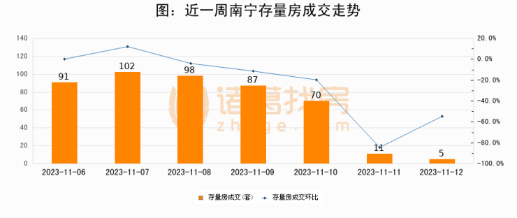从存量房来看,2023年11月12日南宁存量房单日成交5套,比昨日减少6套,环比下降54.5%。从近一周存量房成交来看,南宁存量房日均成交套数为66套,11月12日单日成交5套,低于近一周平均水平92.4%。