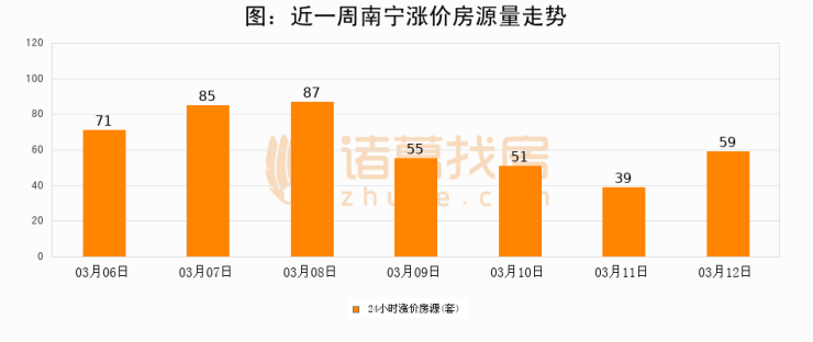 根据诸葛找房数据显示,南宁24小时涨价房源量为59套,较03月11日增加20套,环比上涨51.3%。与此同时,涨价房源占比小幅扩大,业主信心有所提升。