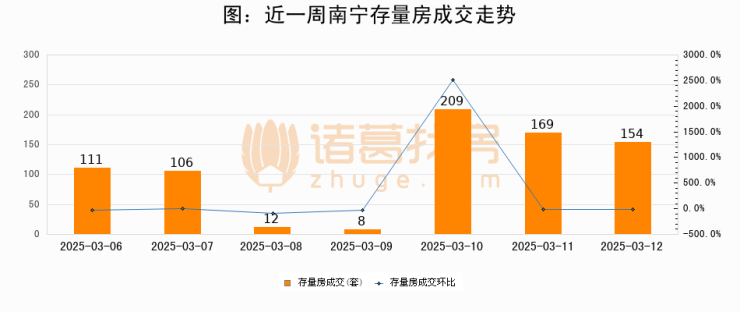 从存量房来看,2025年03月12日南宁存量房单日成交154套,比昨日减少15套,环比下降8.9%。从近一周存量房成交来看,南宁存量房日均成交套数为109套,03月12日单日成交154套,高于近一周平均水平41.3%。