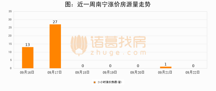 根据诸葛找房数据显示,南宁24小时涨价房源量为0套,较09月21日减少1套,环比下降100%。与此同时,涨价房源占比小幅回落,对于购房者来说是一个入市窗口期,购房者可抓住时机入市。
