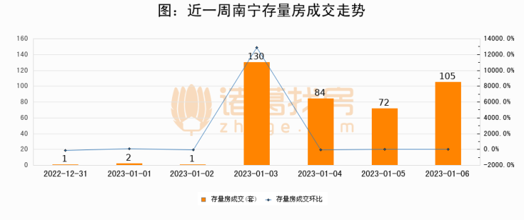 从存量房来看,2023年01月06日南宁存量房单日成交105套,比昨日增加33套,环比上涨45.8%。从近一周存量房成交来看,南宁存量房日均成交套数为56套,其中01月03日成交量最高为130套,01月06日单日成交105套,高于近一周平均水平87.5%。