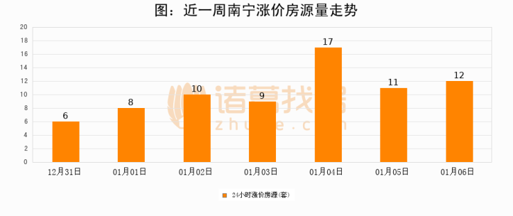 根据诸葛找房数据显示,南宁24小时涨价房源量为12套,较01月05日增加1套,环比上涨9.1%。与此同时,涨价房源占比小幅扩大,业主信心有所提升。