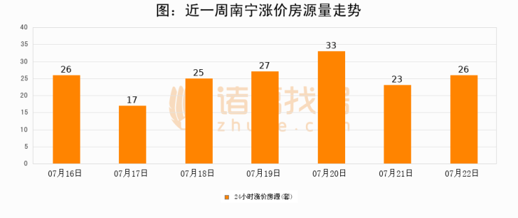 根据诸葛找房数据显示,南宁24小时涨价房源量为26套,较07月21日增加3套,环比上涨13%。与此同时,涨价房源占比小幅扩大,业主信心有所提升。