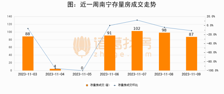 从存量房来看,2023年11月09日南宁存量房单日成交87套,比昨日减少11套,环比下降11.2%。从近一周存量房成交来看,南宁存量房日均成交套数为67套,11月09日单日成交87套,高于近一周平均水平29.9%。