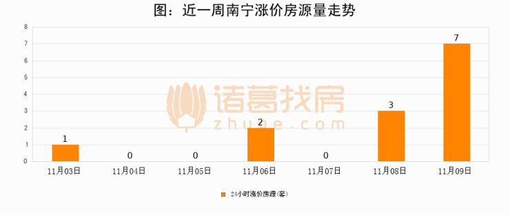 根据诸葛找房数据显示,南宁24小时涨价房源量为7套,较11月08日增加4套,环比上涨133.3%。与此同时,涨价房源占比小幅扩大,业主信心有所提升。