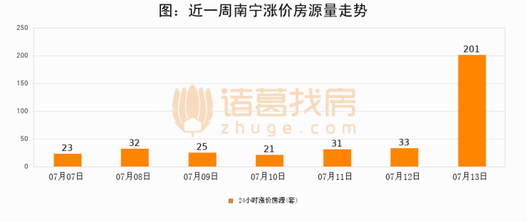 根据诸葛找房数据显示,南宁24小时涨价房源量为201套,较07月12日增加168套,环比上涨509.1%。与此同时,涨价房源占比小幅扩大,业主信心有所提升。