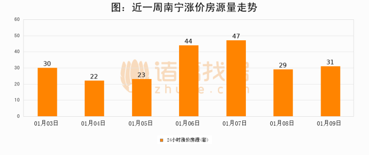 根据诸葛找房数据显示,南宁24小时涨价房源量为31套,较01月08日增加2套,环比上涨6.9%。与此同时,涨价房源占比小幅扩大,业主信心有所提升。