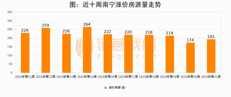 从调价房源来看,第31周南宁涨价房源193套,较上周上涨10.9%。与此同时,31周涨价房源占比提升0.17个百分点,业主信心持续恢复。