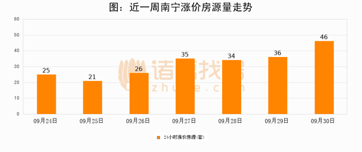 根据诸葛找房数据显示,南宁24小时涨价房源量为46套,较09月29日增加10套,环比上涨27.8%。与此同时,涨价房源占比小幅扩大,业主信心有所提升。