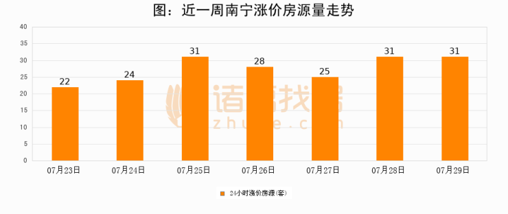 根据诸葛找房数据显示,南宁24小时涨价房源量为31套,较07月28日持平。