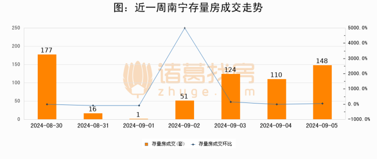 从存量房来看,2024年09月05日南宁存量房单日成交148套,比昨日增加38套,环比上涨34.5%。从近一周存量房成交来看,南宁存量房日均成交套数为89套,09月05日单日成交148套,高于近一周平均水平66.3%。
