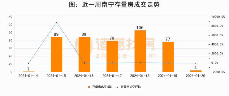 从存量房来看,2024年01月20日南宁存量房单日成交4套,比昨日减少73套,环比下降94.8%。从近一周存量房成交来看,南宁存量房日均成交套数为63套,01月20日单日成交4套,低于近一周平均水平93.7%。