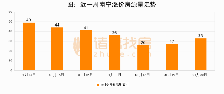 根据诸葛找房数据显示,南宁24小时涨价房源量为33套,较01月19日增加6套,环比上涨22.2%。与此同时,涨价房源占比小幅扩大,业主信心有所提升。
