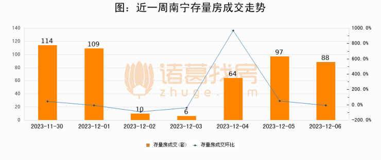 从存量房来看,2023年12月06日南宁存量房单日成交88套,比昨日减少9套,环比下降9.3%。从近一周存量房成交来看,南宁存量房日均成交套数为69套,12月06日单日成交88套,高于近一周平均水平27.5%。