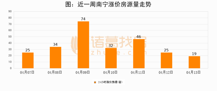 根据诸葛找房数据显示,南宁24小时涨价房源量为19套,较04月12日减少6套,环比下降24%。与此同时,涨价房源占比小幅回落,对于购房者来说是一个入市窗口期,购房者可抓住时机入市。